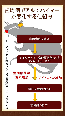 アルツハイマー病ではミロドという蛋白質が脳内に蓄積され、二十数年を経て認知症発するのですが、この研究により、歯周病の炎症は脳内へも波及し、アルツハイマー病の原因分子の脳内レベルが上昇し、認知症(記憶学習能力低下)を増悪させることを証明されました。